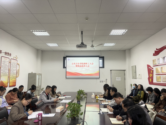 2025年11月10日,公共卫生学院第四届工会委员换届选举大会在东实验楼B328会议室举行,34名工会会员代表参会。会议由学院党委副书记杨晓庆主持。