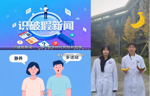 工作室成员在活动中学习视频剪辑、脚本创作、平台运营等技术,探索思政育人新路径。在为期两周的创作周期中,团队紧扣学生实际需求与网络热点,将专业知识转化为生动有趣的短视频内容,创作出《识破假新闻》《香蕉挑选技巧》《医生说法打架听谁的》3个作品,实现了从“舆情观察”到“价值引领”的能力升级。